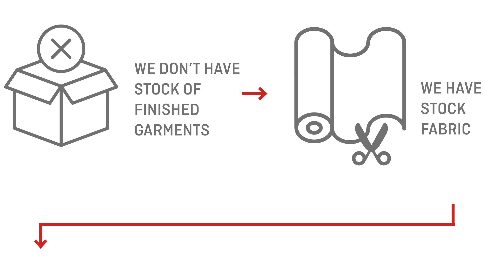 We don’t have stock of finished garments but rather fabrics. Based on this stock, we offer customization options.